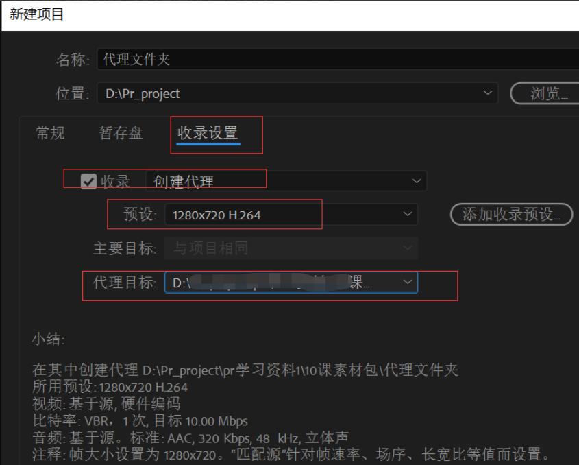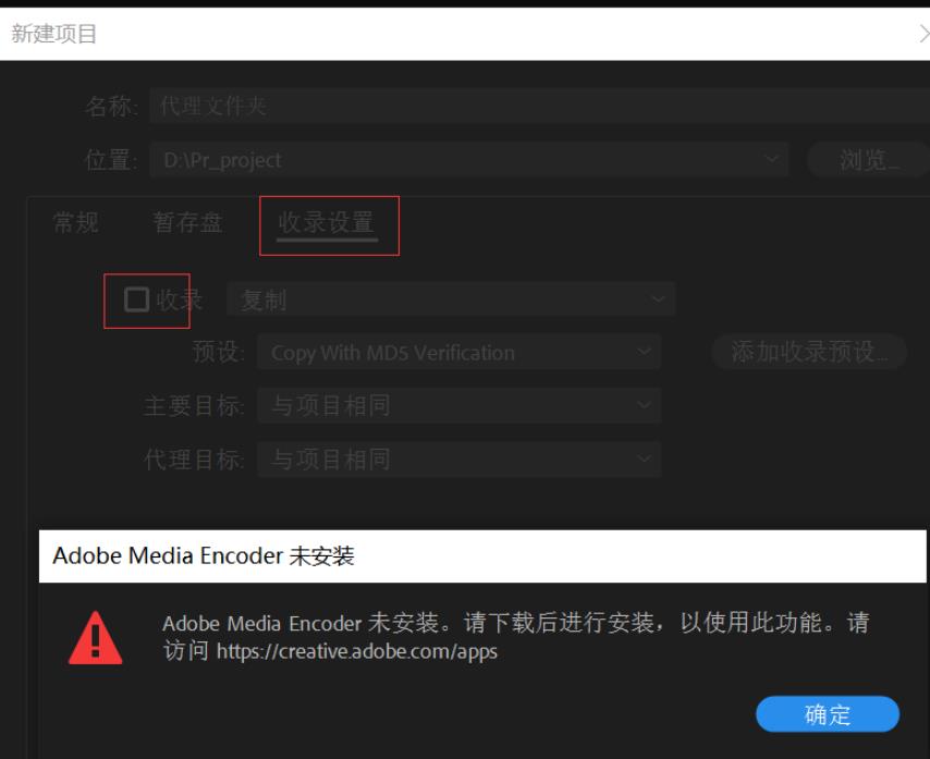 3、打開pr軟件,進行代理設置(收錄設置),如果ME軟件沒有安裝的話會有提示,需要安裝ME軟件,代理設置如下,代理目標選擇第二步創建的代理文件夾,然后點擊確定