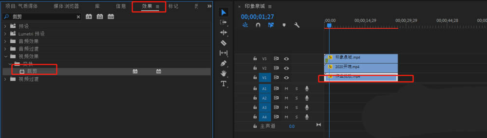 5、當視頻素材中存在不需要畫面時,可以在效果面板選中【裁剪】工具,直接拖動到想要裁剪的視頻素材上