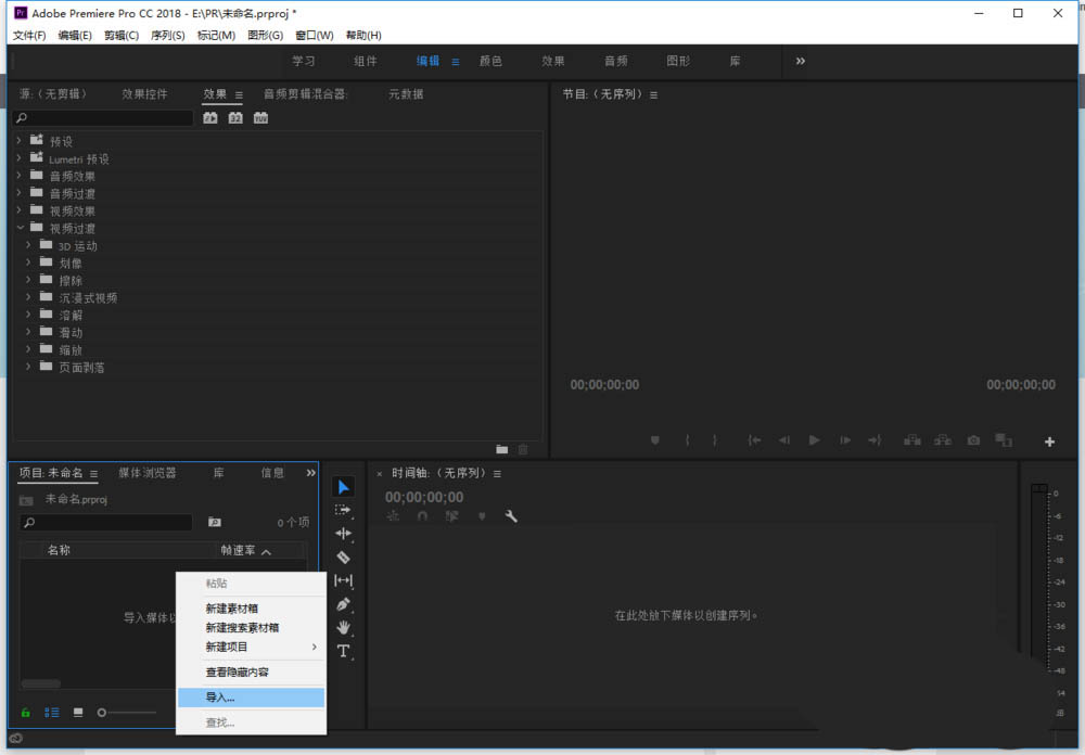 1、啟動PR并新建一個項目,鼠標右鍵點擊左下角的空白處,點擊【導入】。