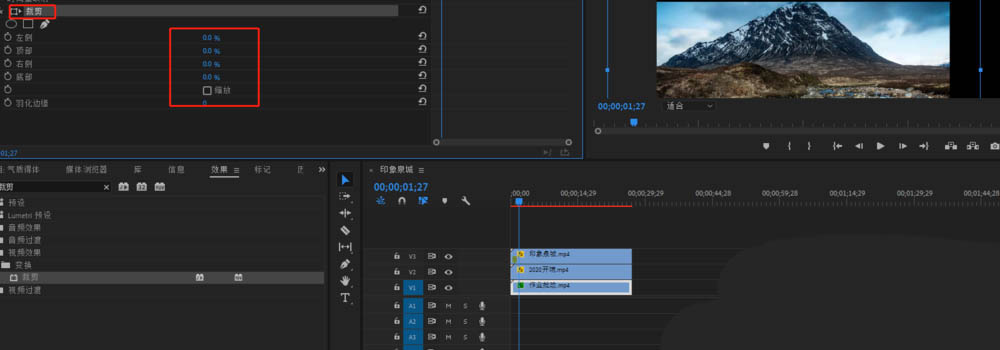 6、然后在特效控制臺中點擊裁剪下的數據,拖動來裁剪視頻,留下需要的部分