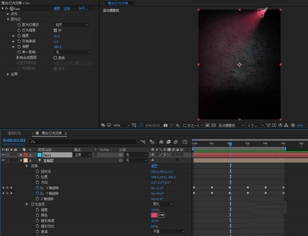 5、給燈光層調整對應的參數給x軸y軸k關鍵幀,調節Lux屬性值;