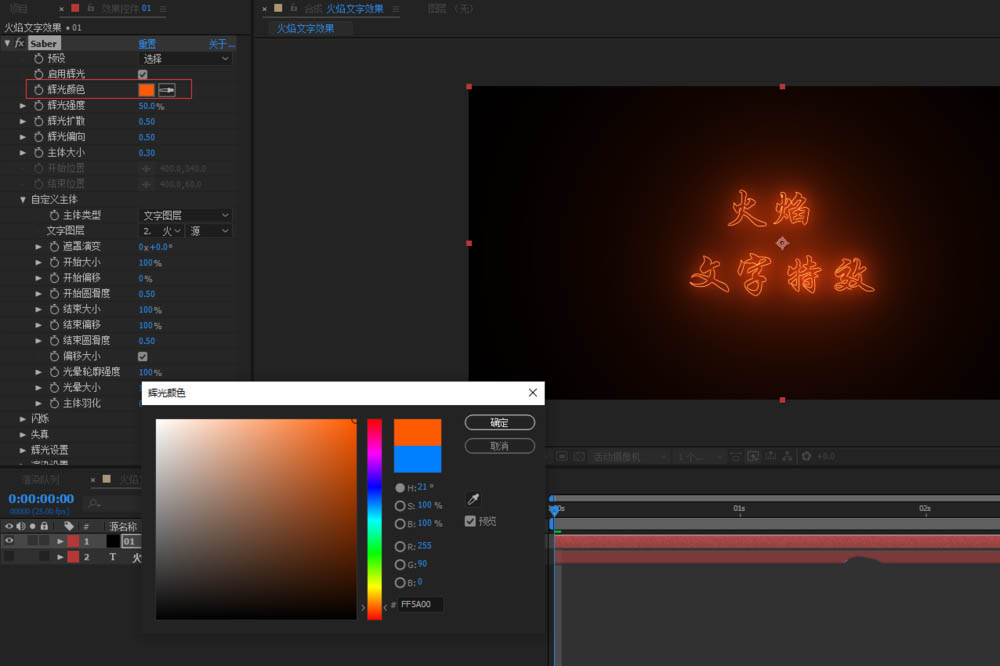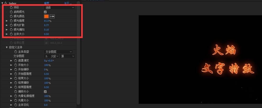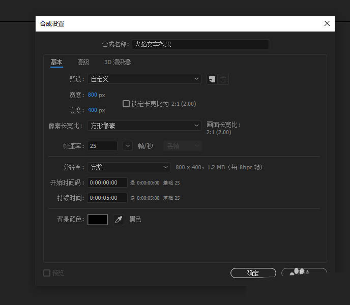 1、打開AE軟件,命名火焰文字效果,調整相應的參數。