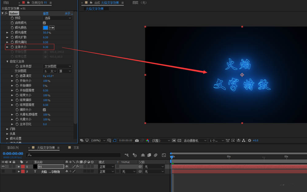 5、選擇我們剛剛創建的文字,可以看到中間有過爆的效果,我們把主體大小降低,就可以看到文字部分了;