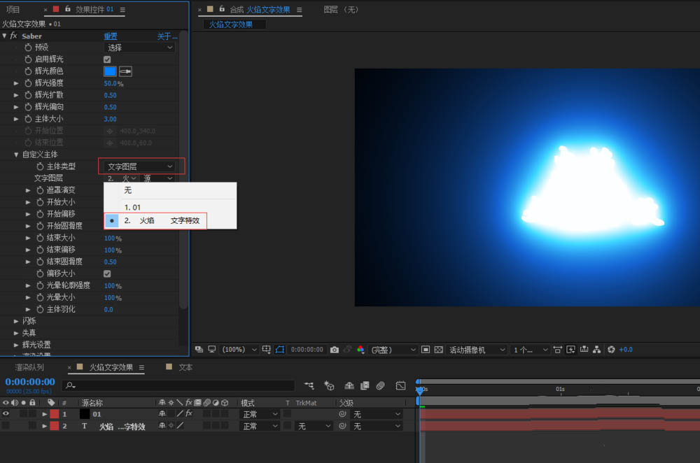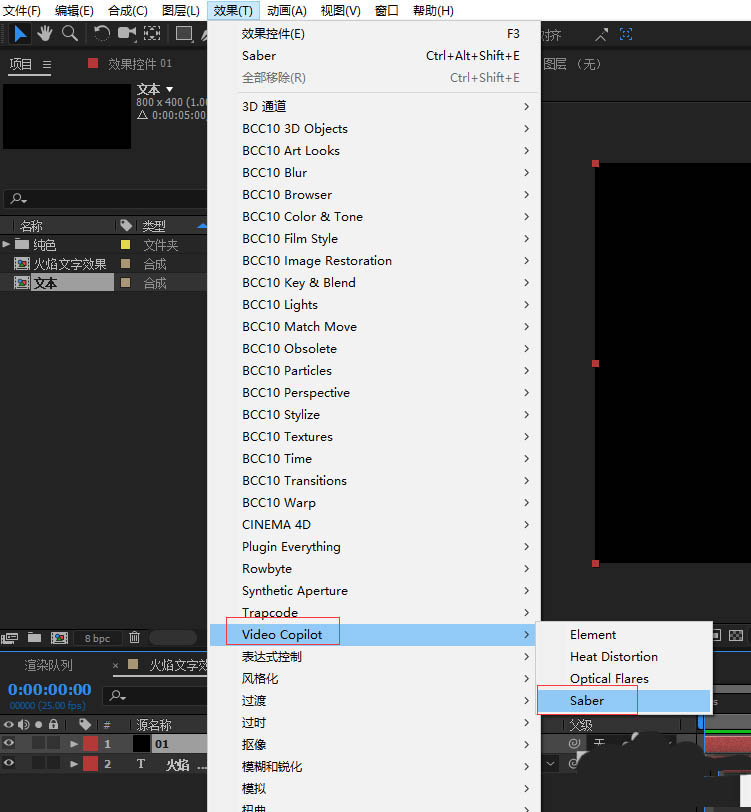 3、ctrl+y新建一個純色層;命名為01;將文本預合成前面的小眼睛關閉掉隱藏,給純色層添加saber插件(這是一個外置插件),saber插件比較常用的是用來實現星際里面的激光劍,能量劍等效果;