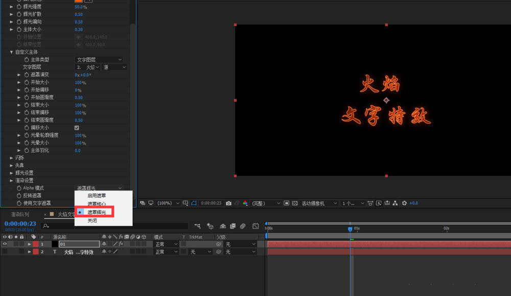 2、渲染設置,Alpha模式,選擇遮罩輝光(文字的外側輝光就會全部消失);(遮罩核心(全部擴散的效果,會有一個模糊的擴散效果),啟用遮罩(只保留內側效果));