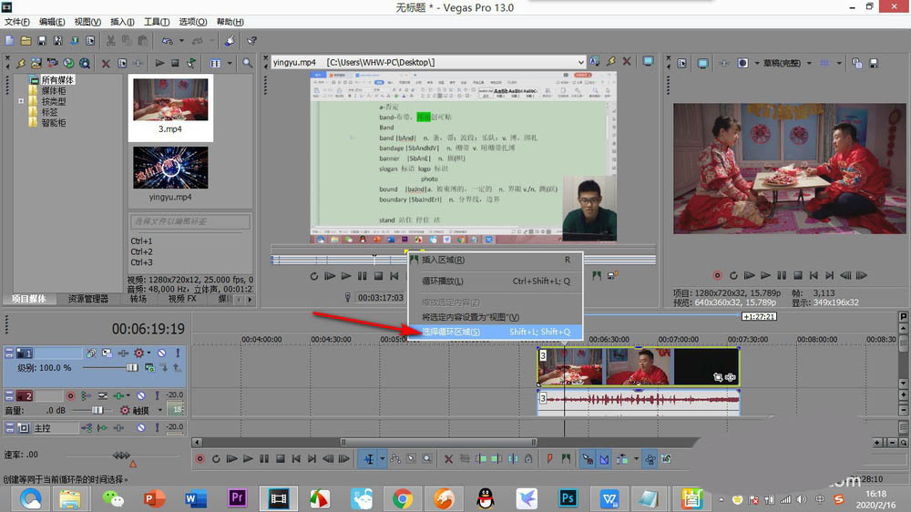 3、將鼠標放在選中區域的位置,鼠標變為橫向雙向箭頭的時候,鼠標右鍵——選擇循環區域。