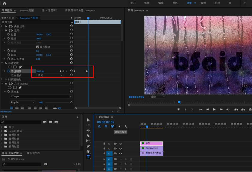 6、最后選中文字素材,在效果控件中找到“不透明度-透明度”在第一幀和合適的位置添加關鍵幀,在第一幀參數為“0%”,另一幀參數為“100%”完成調整即可實現水滴文字效果