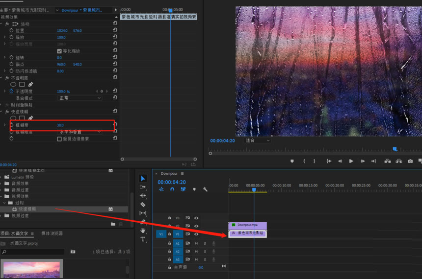 4、在效果中搜索“快速模糊”并應用到城市素材中,并調整“模糊度”的參數