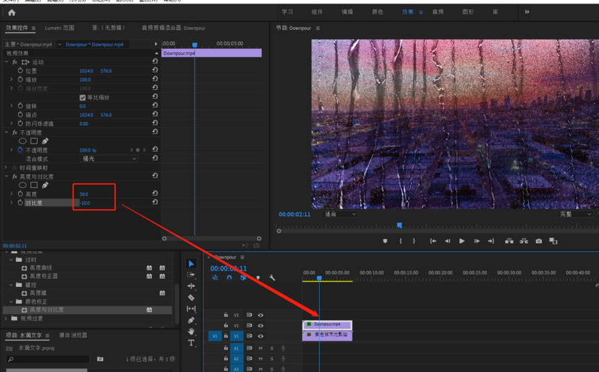 3、在效果中搜索“亮度和對比度”并應用到水滴素材中,并調整“亮度和對比度”的參數