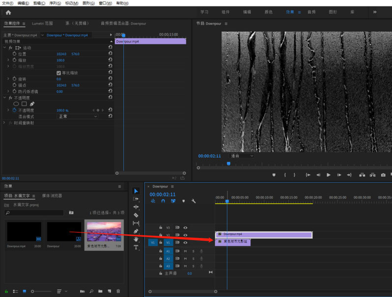 2、選擇水滴素材在效果控件中找到“不透明度-混合模式”將混合模式修改為“強光”,選擇第二個城市素材右鍵“縮放為幀大小”