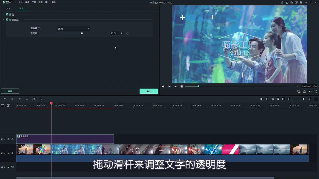 9、還可以點擊影片選項,在影像合成中拖著滑桿來調整文字的透明度。