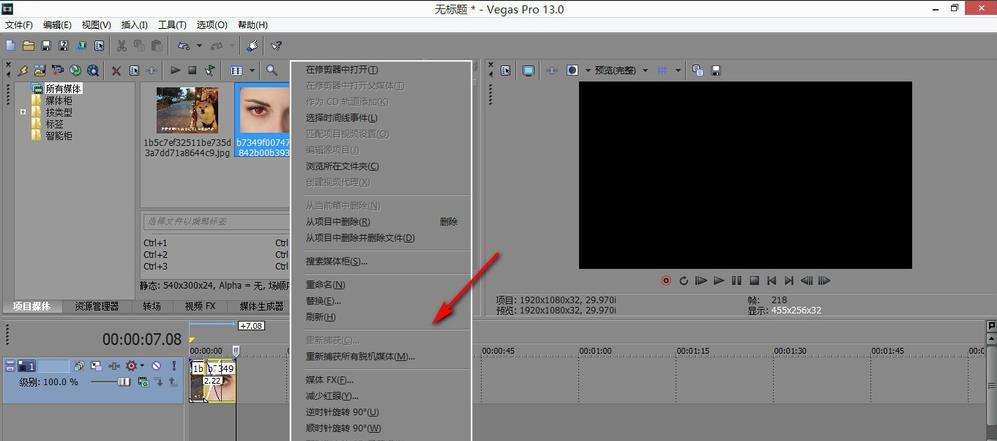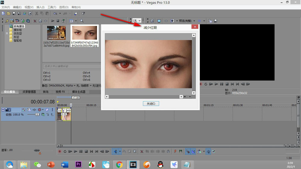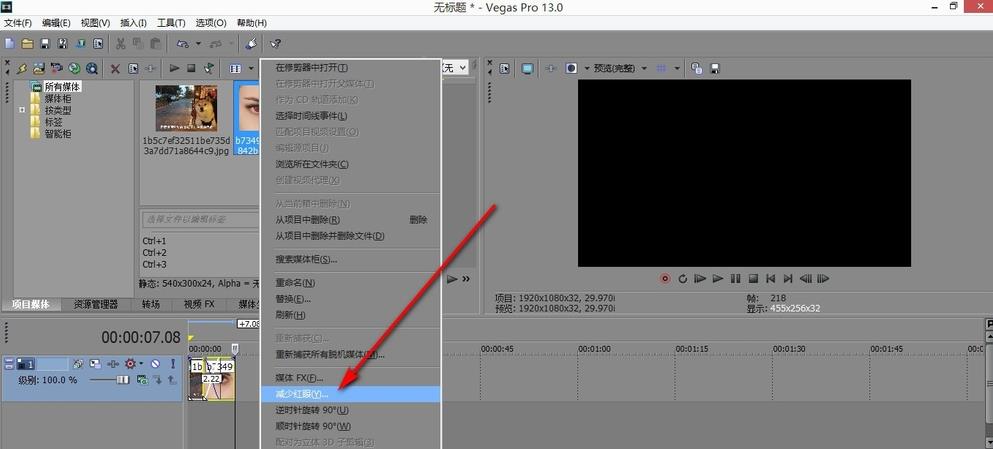 2、這個時候需要注意一定要在項目媒體中鼠標右鍵,不能在時間軸上操作,鼠標右鍵之后選擇——減少紅眼。