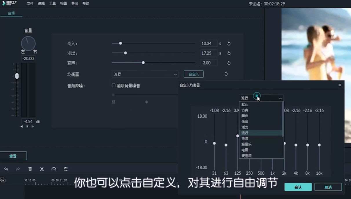 5、可按住“Alt+鼠標點擊”添加關鍵幀,點擊即可刪除,還可以點擊“自定義”對音頻屬性進行調節。