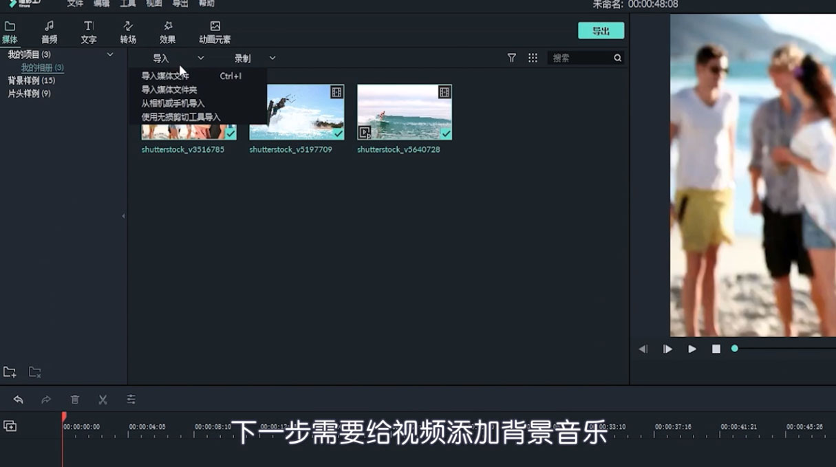 2、點擊“導入”選擇“導入媒體文件夾”,從電腦中導入自己的背景音樂。