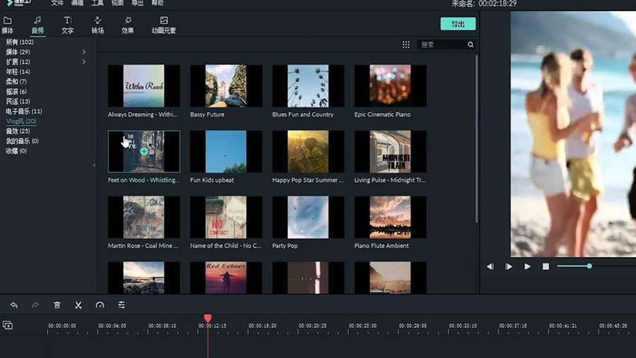 3、沒有音樂時可點擊“音樂庫”,打開喵影工廠的音樂庫,將音頻拖拽到視頻中即可。