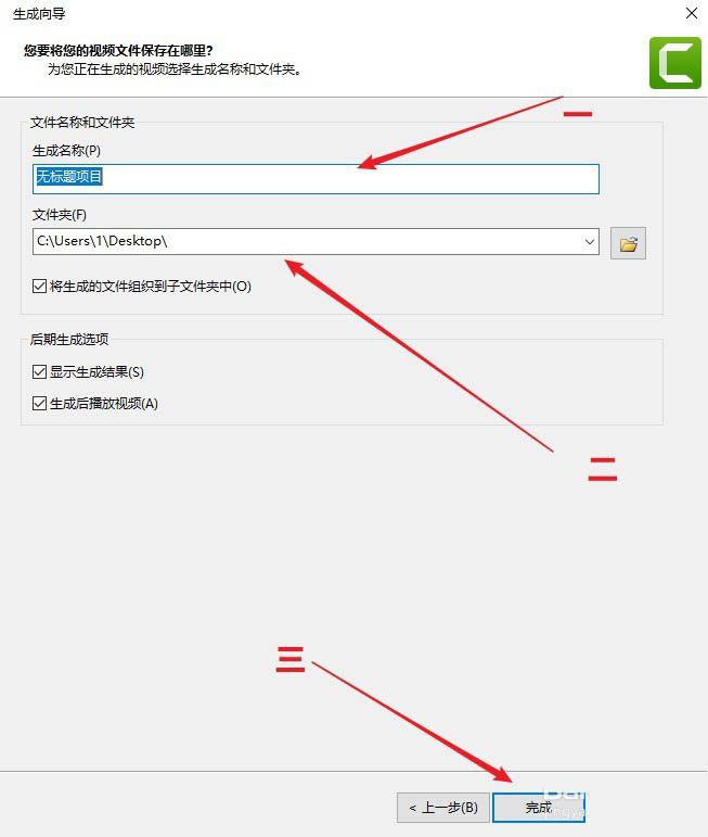 6、選擇導(dǎo)出的視頻名稱與位置,然后點擊底部的“完成”即可。
