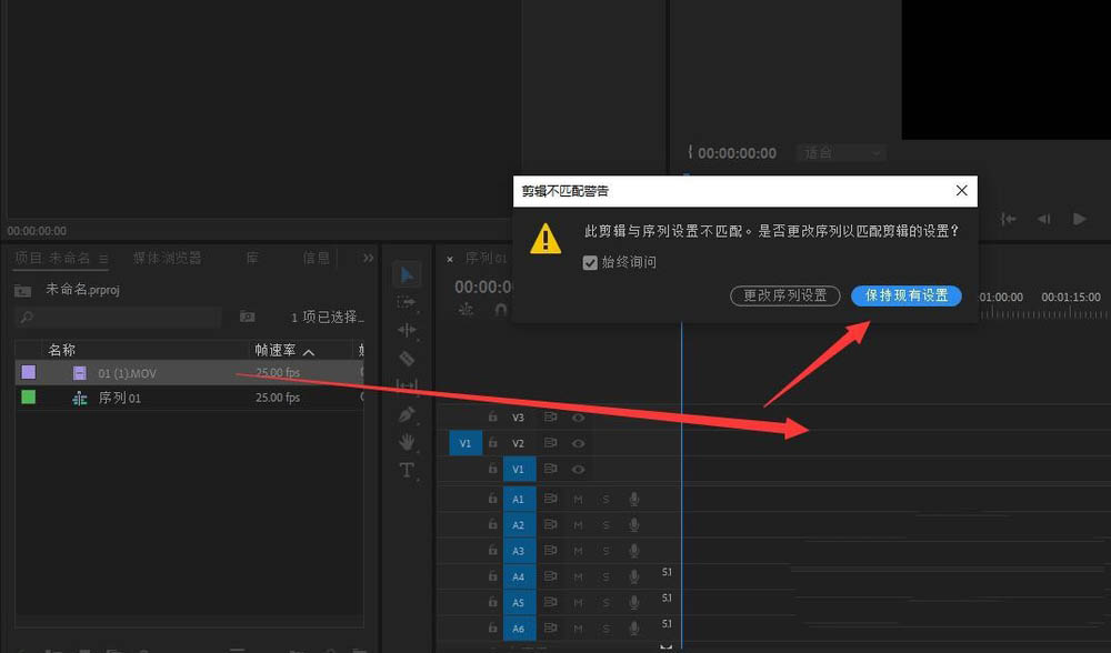 1、將視頻導入PREMIERE的素材庫之后,導入視頻軌道,導入視頻軌道的時候,選擇“保持現有設置”。