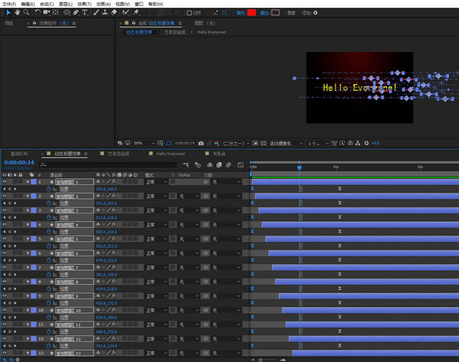 4、選中所有的主文本預(yù)合成,按下p鍵,給文本做一個(gè)從左進(jìn)入畫面的一個(gè)位置變化效果,選中所有的關(guān)鍵,f9來一個(gè)緩動(dòng),調(diào)整曲線速度;