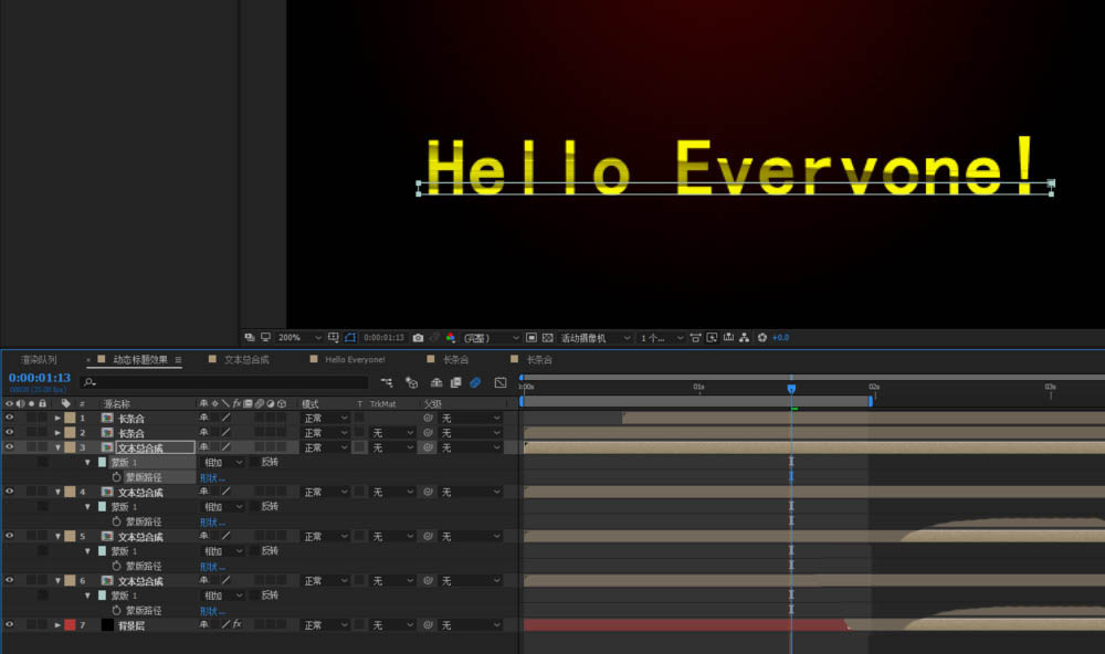 3、選中文本總合成,添加蒙版,先把文本的一小部分顯示出來,復(fù)制文本預(yù)合成,繼續(xù)繪制文本的接下來的一小部分,點(diǎn)擊蒙版進(jìn)行拖拽,重復(fù)操作,直到把文本完整顯示出來;
