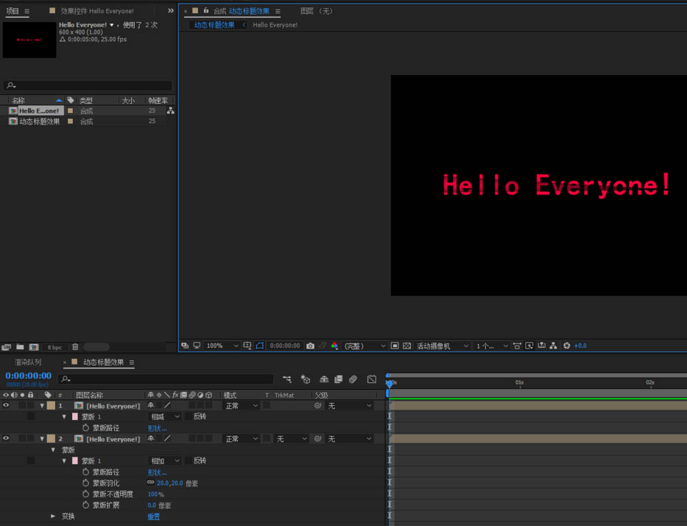 4、選中文本預合成,ctrl+d復制一層文本預合成,選中上層文本預合成按下M鍵打開蒙版選項,將蒙版模式選擇為相減;同樣操作,選中下層預合成按下M鍵打開蒙版選項,將遮罩羽化修改為20px;