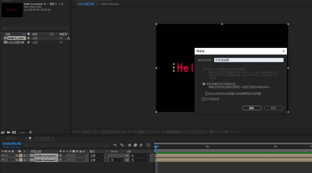 5、選中兩個文本預合成,ctrl+shift+c預合成,命名為文本總合成;