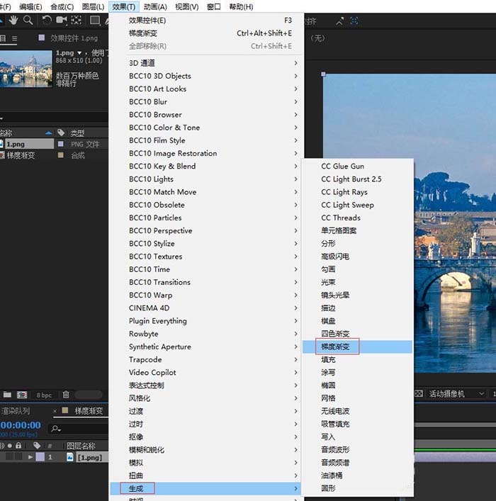 3、選中圖片素材,添加梯度漸變,效果-生成-梯度漸變;