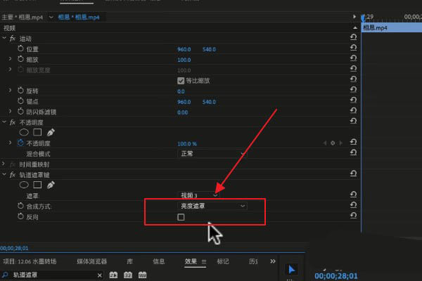 5、在【效果控件】中,我們將【遮罩】的軌道選擇為水墨畫轉場效果所在的軌道。