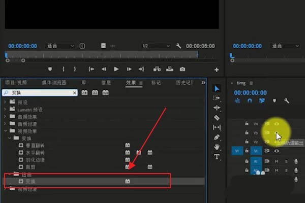 3、然后我們在【效果】中選擇【變換】功能添加給V2軌道的圖片素材。