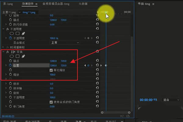 4、我們在【效果控件】中找到【位置】,添加關(guān)鍵幀,然后將位置坐標(biāo)調(diào)低一點點。