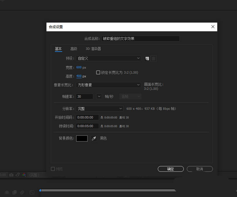 1、打開AE軟件,新建合成,命名破碎重組的文字效果,調整相應的參數。