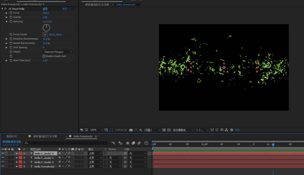5、ctrl+t再次輸入自己想要的文字同樣添加CC pixel polly-CC像素多邊形效果;將剛剛設置好的參數復制過來,同樣將文字圖層ctrl+d多復制幾層,做同樣的操作通過修改網格間隔參數來使碎片復雜豐富化,同樣ctrl+shift+c 預合成 ;
