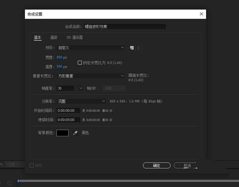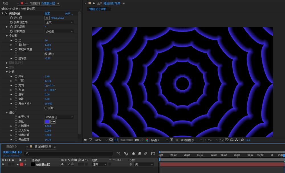 1、打開AE軟件,命名螺旋波形效果,調整相應的參數。