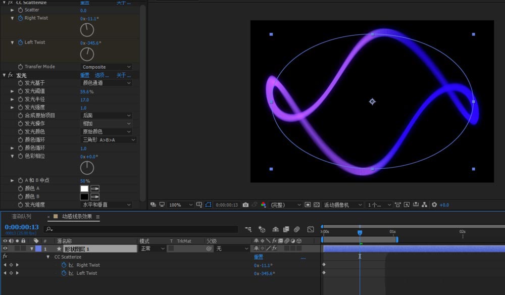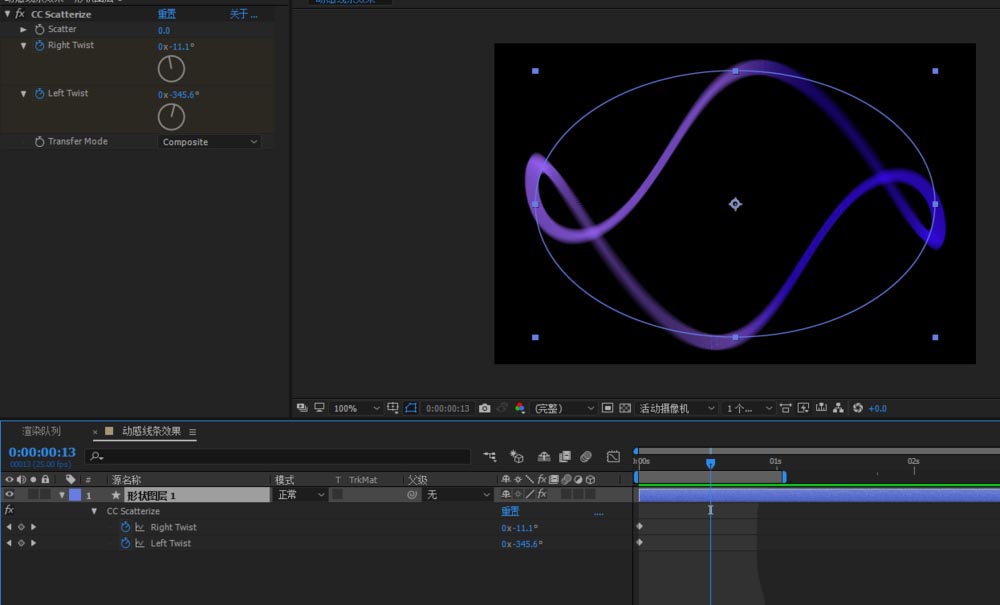 3、選中橢圓,添加 cc scatterize 效果,橢圓不需要成粒子效果,只需要做扭曲效果,扭曲成你想要的的樣子就行;