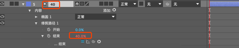 5、在修剪路徑下方的結束處,輸入數值40,在左邊的碼表處按住Alt鍵,調出表達式,輸入:thisLayer.name,確定.