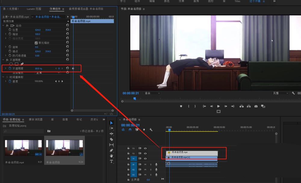 4、選中向后移動3幀后的視頻軌道2的視頻素材,打開效果控件窗口,設置其不透明度為80%。
