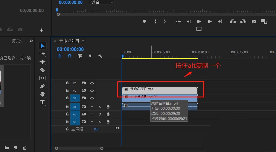 2、將視頻的音視頻進行分離,然后單獨選中視頻軌道的視頻文件,按住alt鍵進行復制一個到視頻軌道2.