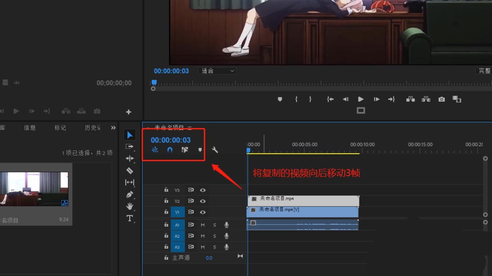 3、將時間軸指針向前進3幀,并將復制的視頻素材整體向右移動3幀。
