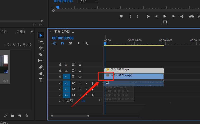 5、將原來的視頻軌道1的視頻素材前面3幀裁剪掉,這樣兩個視頻素材就對齊了。