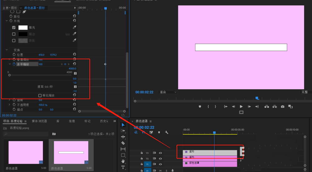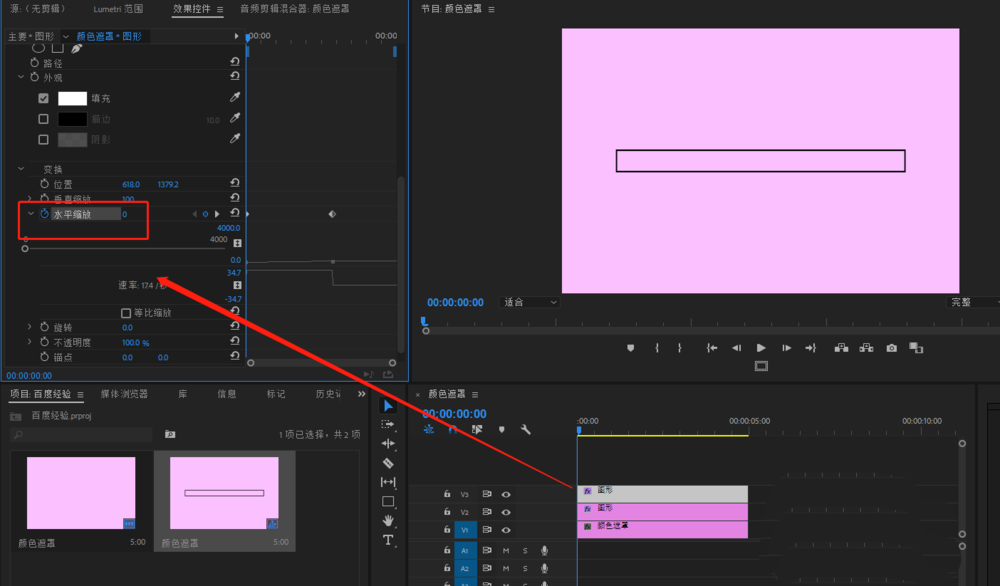 5、將時(shí)間軸移到中間位置,然后選中視頻軌道3的矩形并打開(kāi)效果控件,去掉等比縮放勾選找到水平縮放,并打入一個(gè)關(guān)鍵幀。