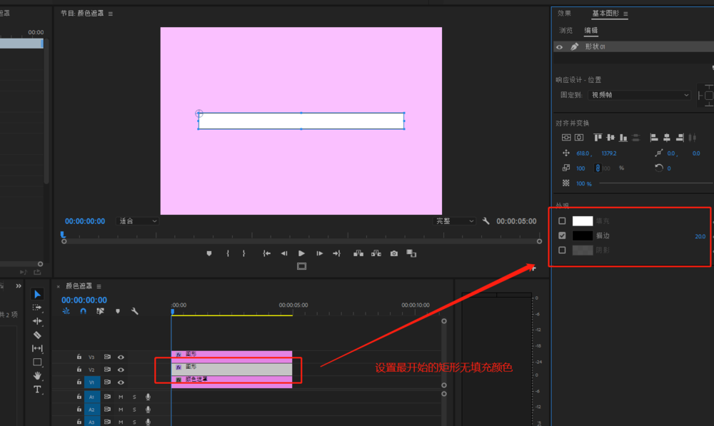 4、選擇原來(lái)的視頻軌道2的矩形,在基本圖形設(shè)置中,設(shè)置其無(wú)填充顏色,并設(shè)置描邊顏色為黑色,數(shù)值為20.