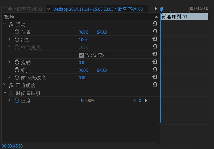 5、然后點(diǎn)擊這個(gè)剛嵌套玩的這個(gè)素材,在左上方效果控件面板中,我們可以找到不透明度,我們打開不透明度