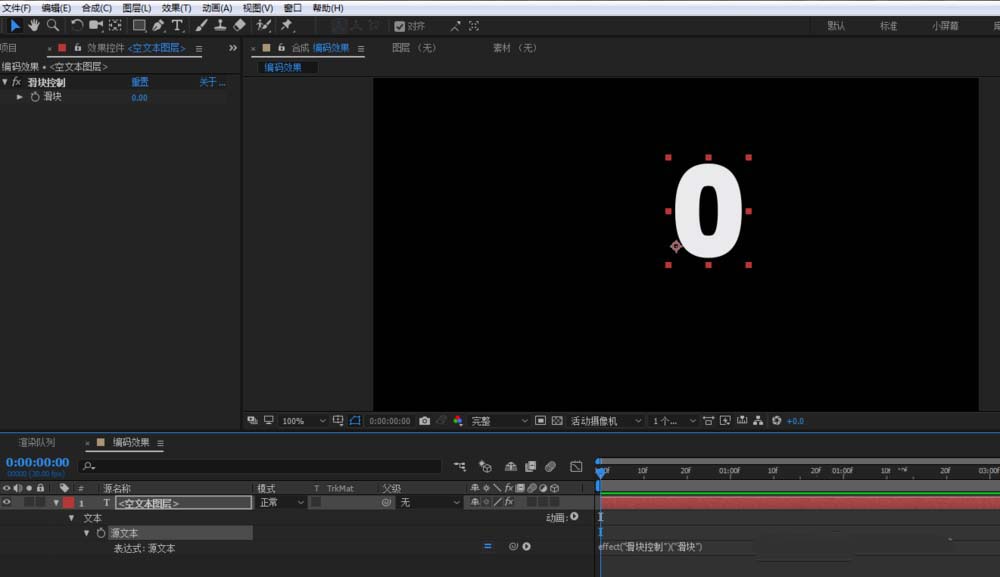 4、選中文本圖層,按下uu鍵,打開源文本,按下Alt鍵,把表達式關聯器拉到滑竿控制,這樣滑竿就可以直接控制文本了;