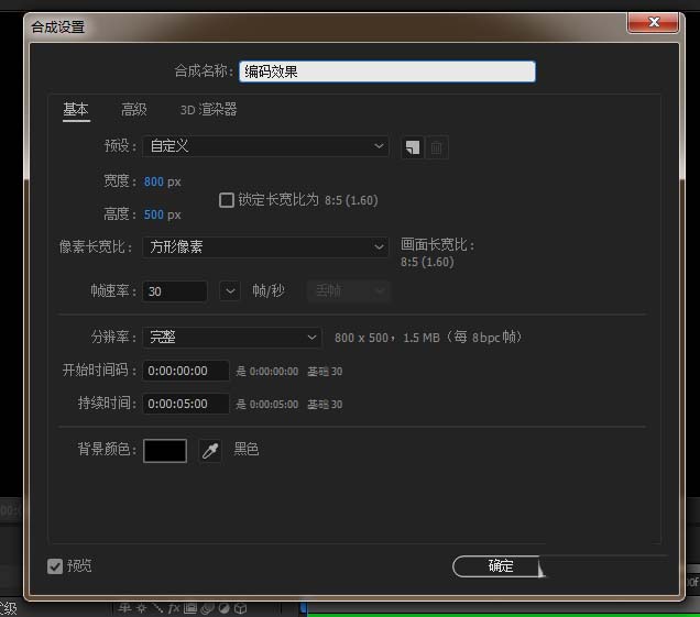 1、打開AE軟件,命名編碼效果,調整相應的參數。