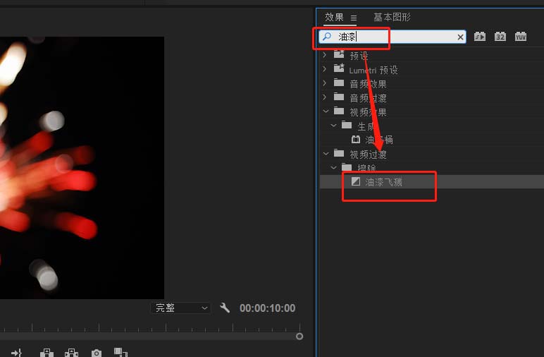 4、勾選了效果窗口之后,可以切換到效果窗口,輸入關鍵字進行搜索,找到“油漆飛濺”視頻過渡效果。