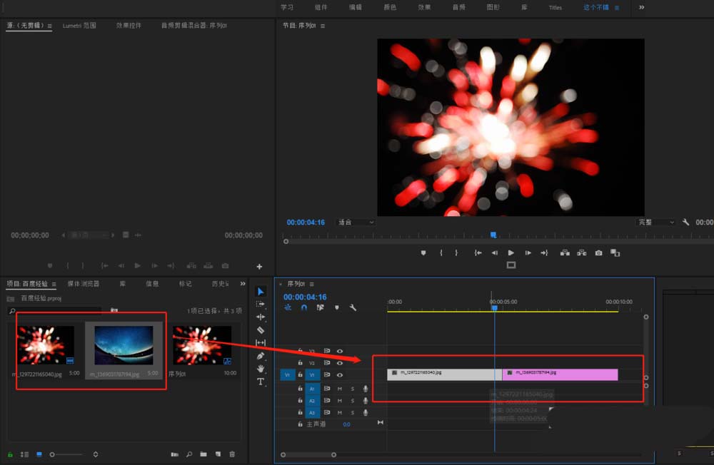 2、設置了序列并創建之后,在將素材媒體都依次移動到序列的視頻軌道。