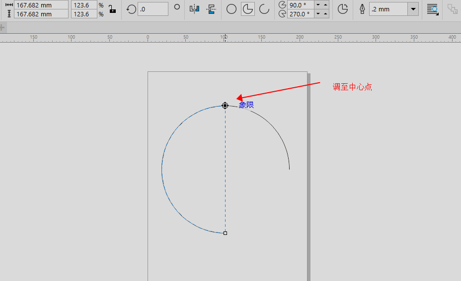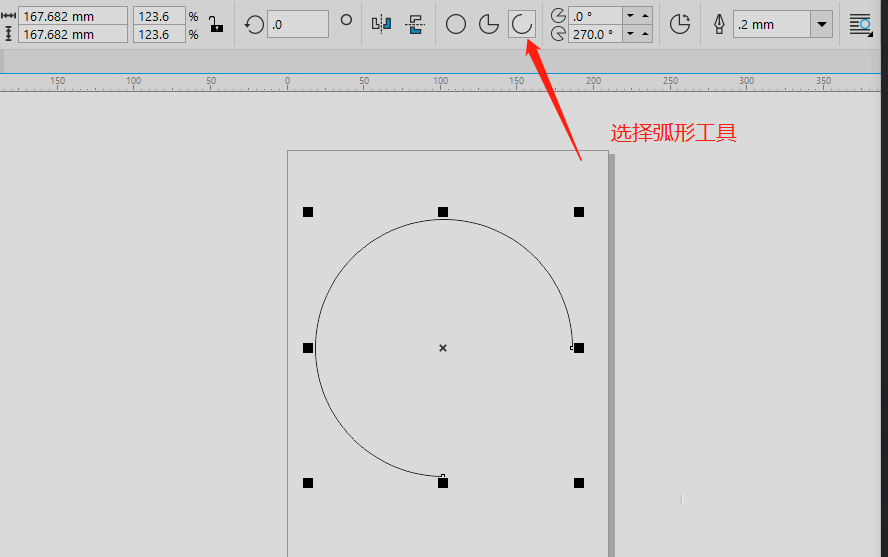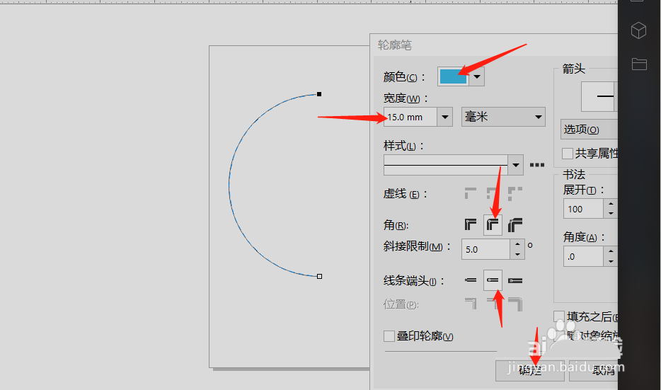 2、選擇弧形工具,調(diào)整至垂直中心點(diǎn)對其,然后按F2鍵調(diào)出輪廓筆,設(shè)置好喜歡的顏色、設(shè)置線的厚度、角、線條端頭為圓頭,最后點(diǎn)擊確定按鈕。