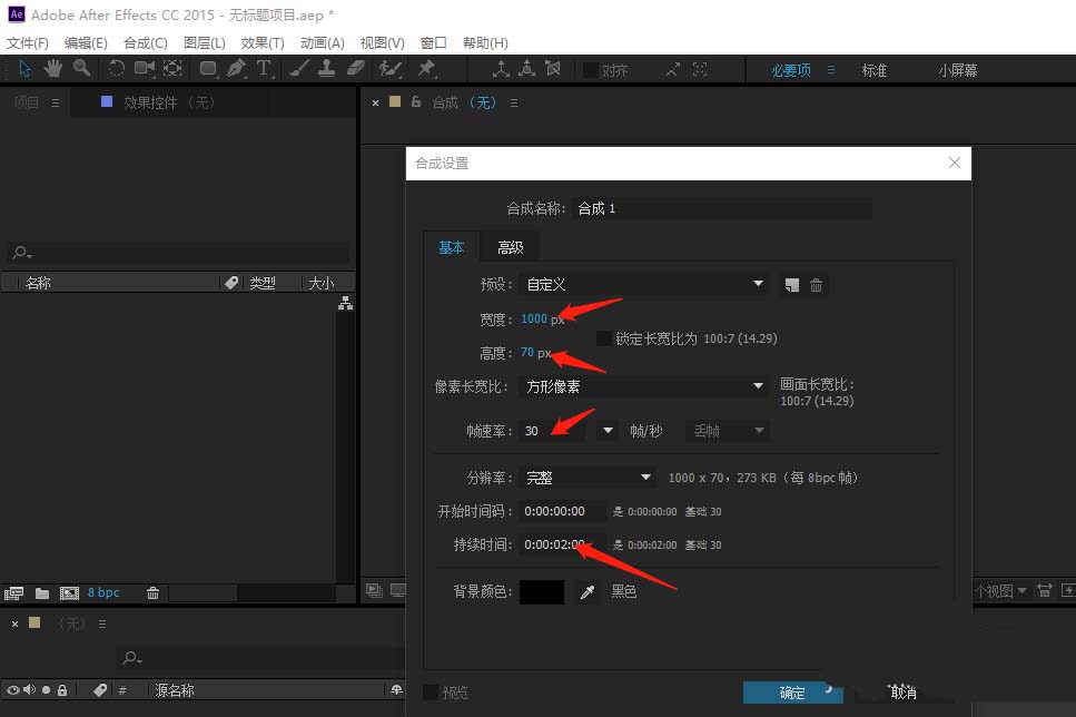 1、打開AE軟件,按CTRL+N新建一個合成,設置好長度和寬度和時間長度,再點擊確定按鈕。