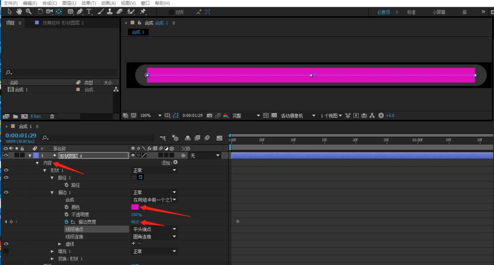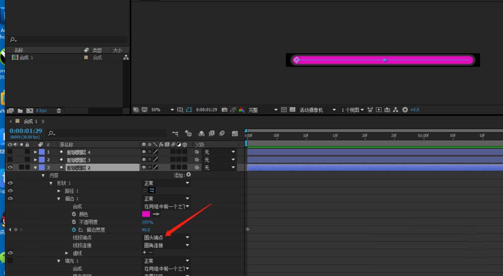 5、點開內容項,設置好線條的寬度和顏色。最后線條兩端設置它的圓點,這時候按空格鍵就可以看見它的動畫效果了。這時候可以導出圖片序列了。按CTRL+M彈出對話框,設置好文件存放路徑,設置好圖片格式,和透明通道,再點擊確定按鈕,再點擊渲染按鈕,最后得到圖片序列。