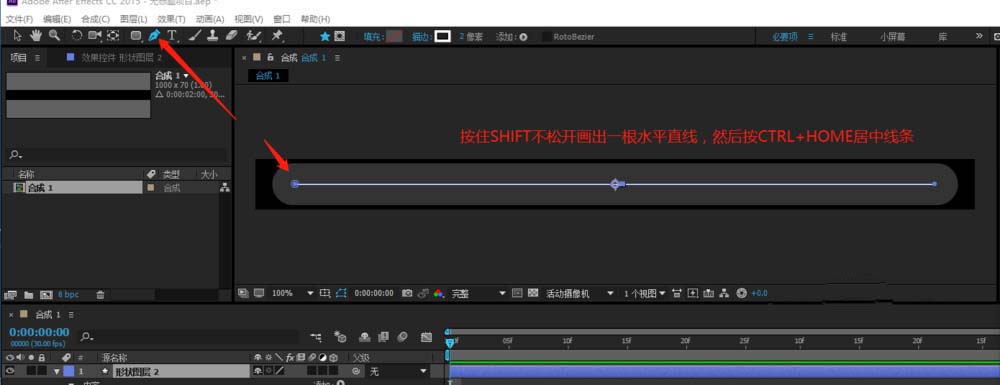 3、選擇鋼筆工具,按住SHIFT鍵并用鼠標畫出一條水平直線,調整好線的長度,然后按CTRL+HOME居中線條。