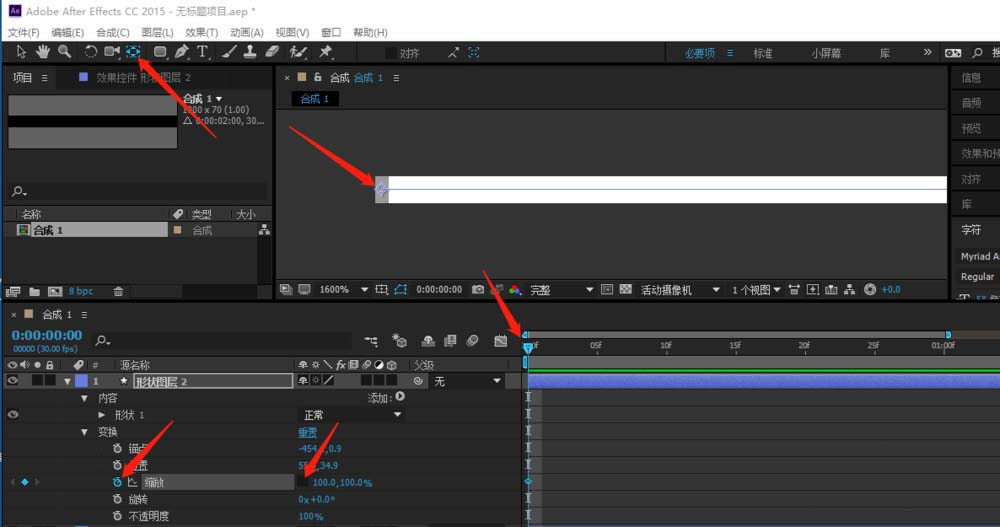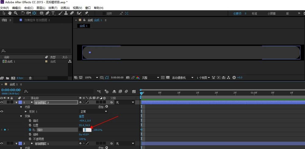 4、選擇錨點工具,把線條的中心點調到線條的左邊線端,在第一幀設置縮放關鍵幀并去掉框中的鏈條。再到縮放里設置線條長度為0,再到最后一幀設置線條長度為100。